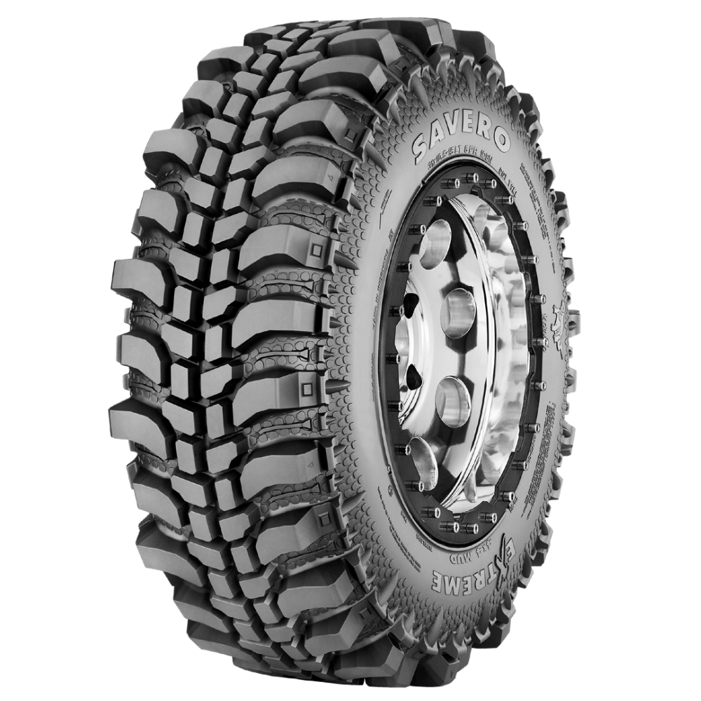 O Savero Komodo Mud Extreme é um pneu agressivo para lama extrema, projetado para auto-limpeza e com sulcos laterais abertos que cavam e removem a lama eficientemente. Suas garras Komodo e padrão de pele melhoram o visual agressivo e aumentam a tração em lama profunda e macia.
